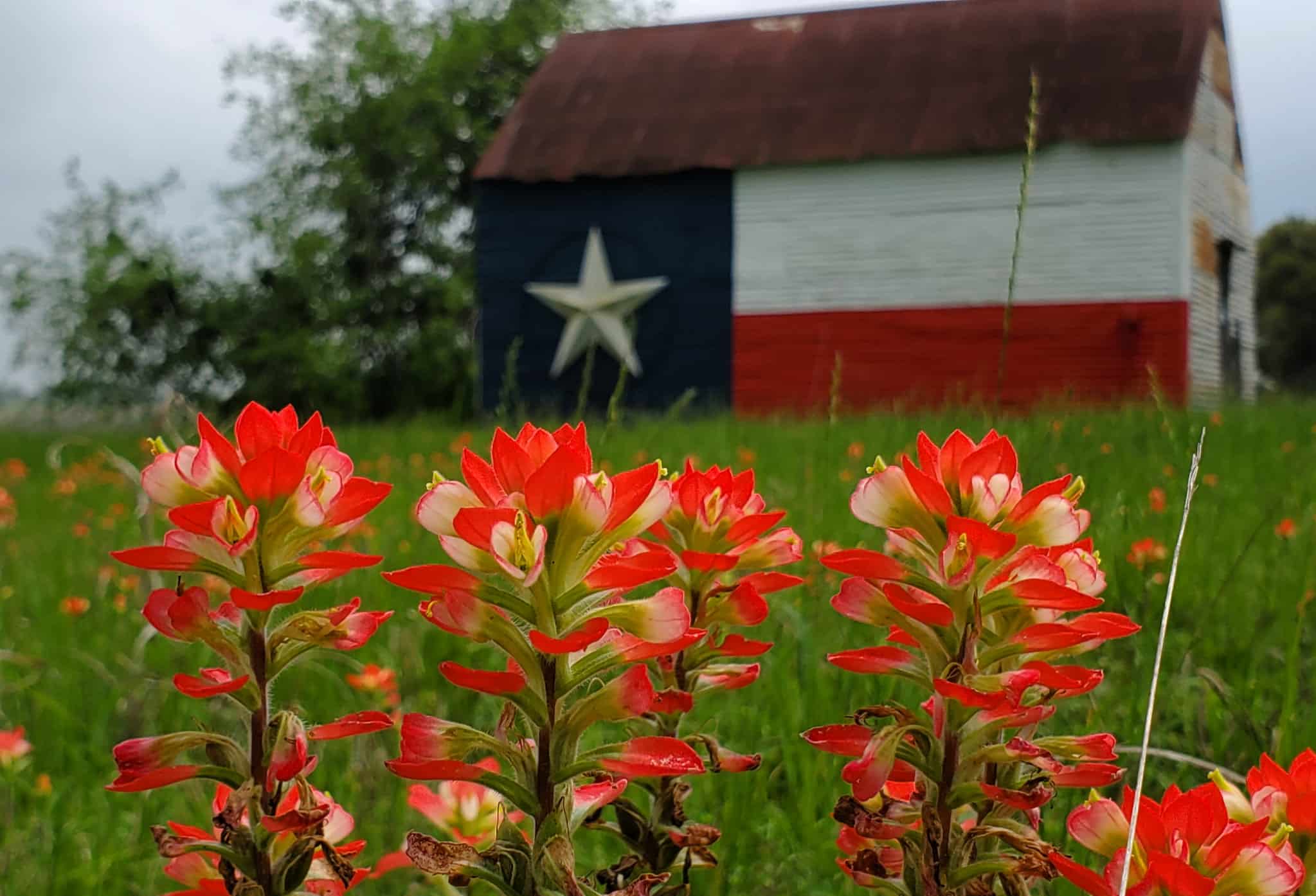 “Bluebonnets and Barns” | Sunset glows on a hilltop barn with bluebonnets – peaceful in Ennis, TX | Submitted by Charmain Nelson